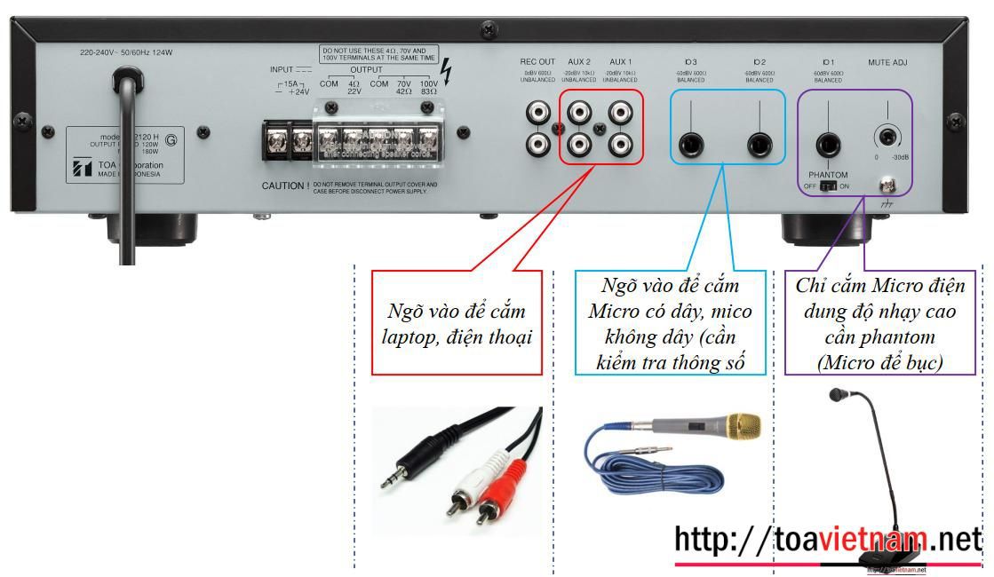 Đầu ra loa: cân bằng Trở kháng cao: 42Ω (100V), 21Ω (70V) Trở kháng thấp: 4Ω (31V) Ngõ ra cho ghi âm: 0dB (0 dB=1V), 600Ω, không cân bằng, kiểu giắc RCA (giắc hoa sen) |